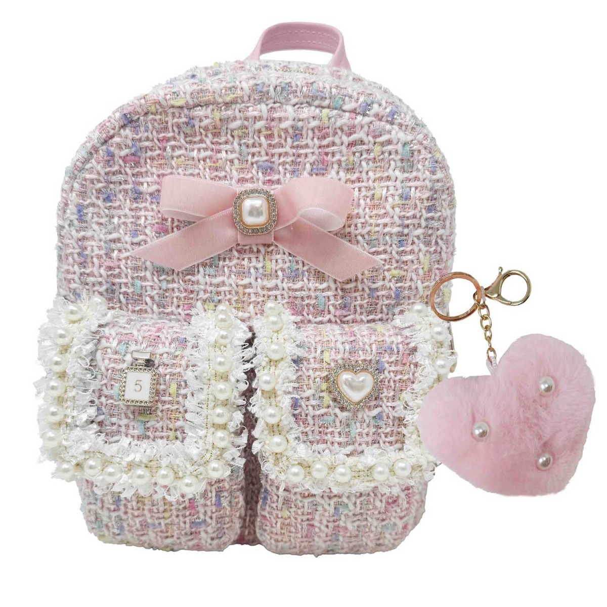 <div class="k_page_pozycja_left_info_element"> <div class="opis"> <div class="item item-6"> <p>Elegancka torebka typu crossbody z tweedu ozdobiona kokardą z cekinów, zawieszką (pluszowym brelokiem) w kształcie serca i łańcuszkiem. Kwiatowe akcenty i zabawne detale nadają jej stylowy i fantazyjny wygląd. Pomieści niezbędne akcesoria małej miłośniczki mody i trendów. Idealna na imprezy, jako prezent lub na co dzień. Zapinana na magnetyczny zatrzask.</p> <p>Kolor: odcienie różowego/złoty.</p> <p>Wiek: 5+</p> <p>Wymiary: 19,5 x 13,5 x 7 cm.</p> </div> </div> </div>
