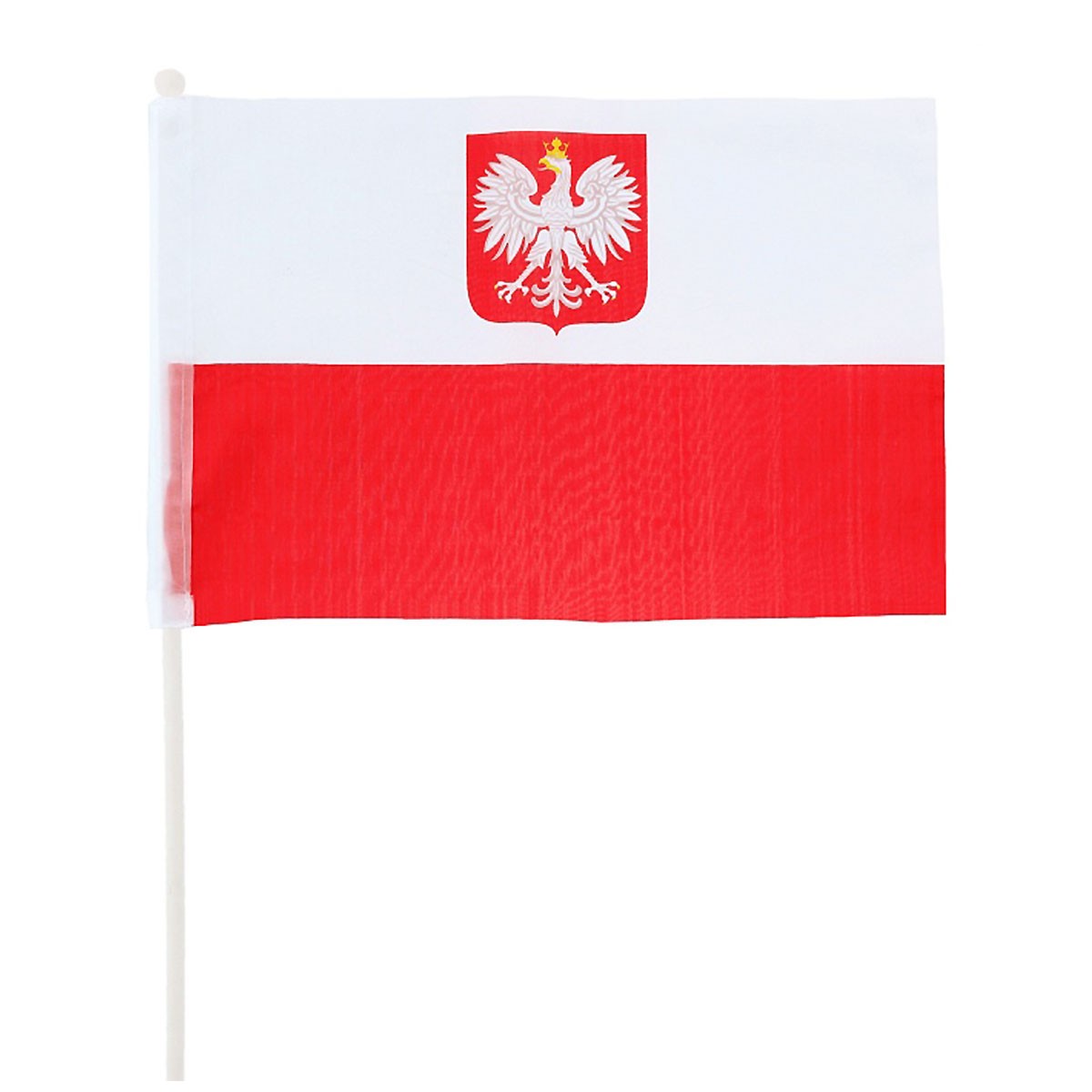 • <p>Biało-czerwona flaga z godłem Polski wykonana z poliestru, <br />mocowana na białym plastikowynm patyczku. <br /> Wymiary flagi: 43 cm x 29.5 cm <br />Długość patyczka: 60 cm.</p>