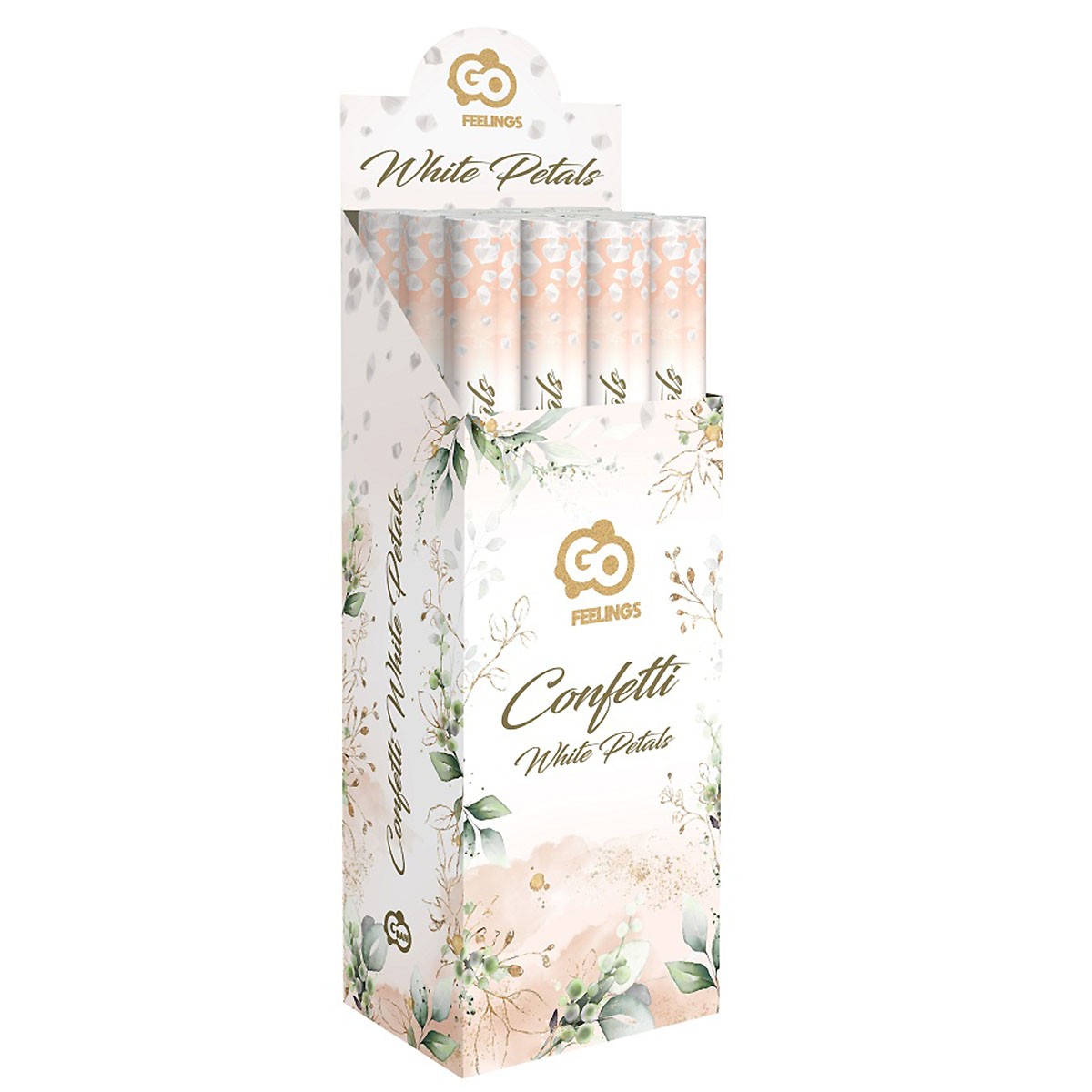 Z tuby wylatują białe płatki róż z materiału. Konfetti nie zawiera ładunków pirotechnicznych. Wyrzut następuje za pomocą sprężonego powietrza. Do artykułu dołączona jest instrukcja obsługi. Produkt przeznaczony tylko dla osób dorosłych. Piękny prezent na ślub lub wesele.