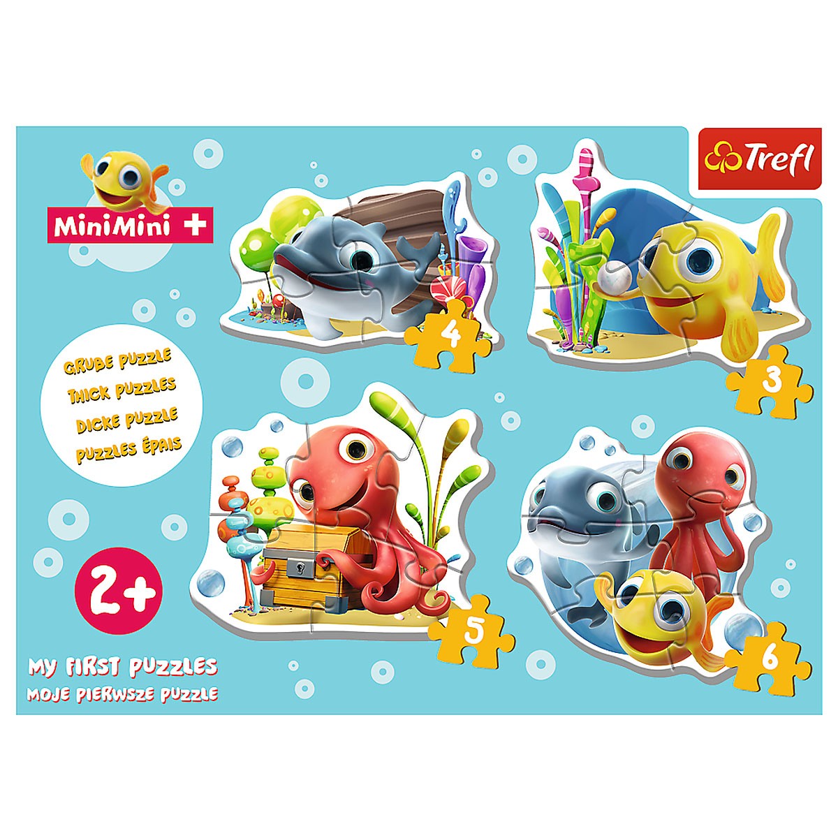 Baby Puzzle ze znanymi wszystkim małym dzieciom bohaterami kanału MiniMini. Puzzle zostały wykonane z grubego kartonu i są idealne dla dzieci już od 2 roku życia. Żywe kolory i przyjazne kształty zachęcają maluchy do zabawy. Puzzle składają się z 4 niezależnych układanek, każda o innej ilości elementów (3, 4, 5, 6) i prezentują rybki z uwielbianej przez najmłodszych stacji MiniMini.