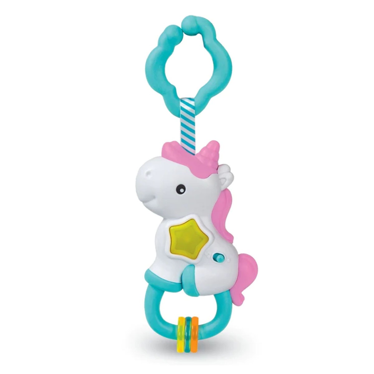 Posiada lśniący przycisk w kształcie gwiazdki oraz kolorowe zawieszki, które wydają z siebie zabawne dźwięki.