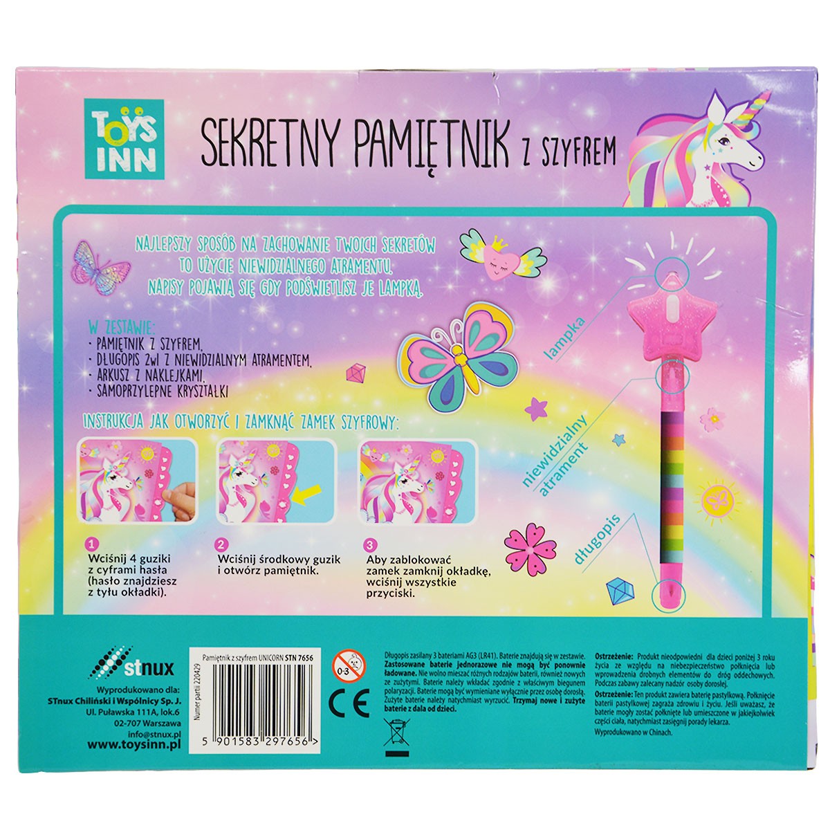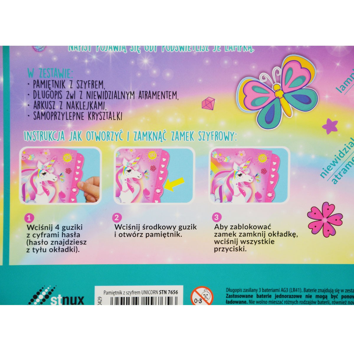 Dzięki użyciu długopisu z niewidzialnym atramentem napisy, które napisałeś, pojawią się, dopiero gdy podświetlisz je lampką. Pamiętnik wykonany jest w motywie jednorożców.