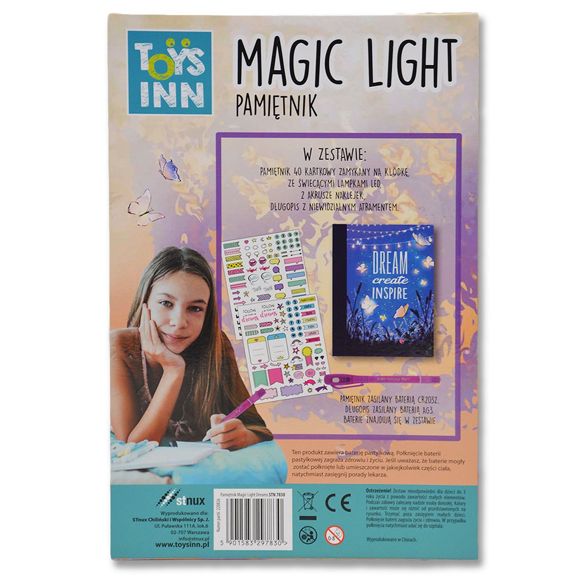 Zestaw składa się z uroczego, 40 kartkowego pamiętnika ze światełkami, zamykanego na kłódkę. Pamiętnik utrzymany jest w pięknej, pastelowej kolorystyce. Wzór graficzny, który znajduje się na okładce produktu, przedstawia motylki na łące. Dodatkowo znajdziemy na nim napis "Dream create inspire". Produkt posiada funkcję try me! Na okładce umieszczony jest niebieski przycisk, który po naciśnięciu aktywuje kolorowe światełka.