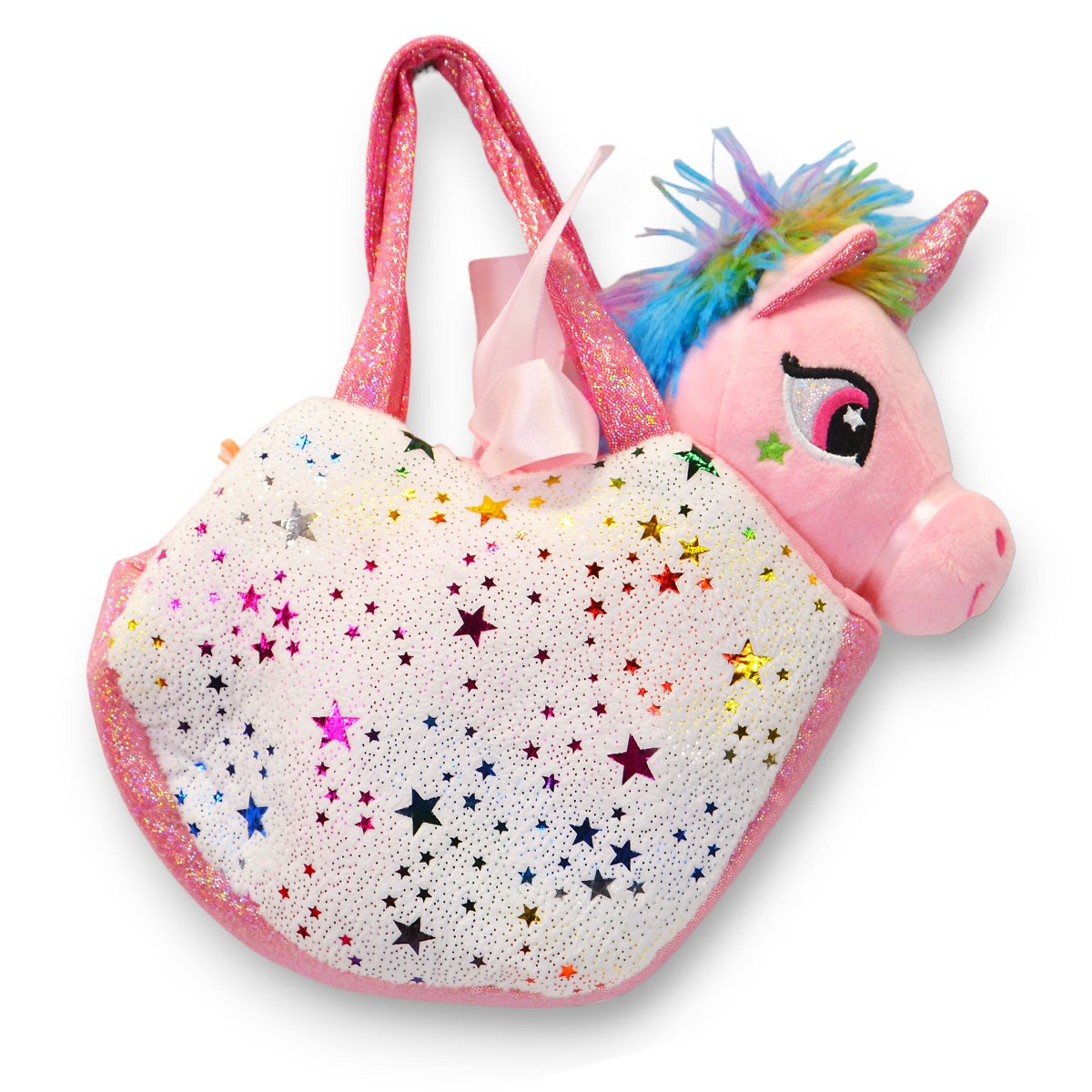 Śliczny pluszowy jednorożec wywoła u każdego właściciela uśmiech na twarzy. Dzięki ślicznej połyskującej torebce w gwiazdeczki lub w motywie kosmosu, dziewczynka zabierze go dokądkolwiek zechce np. do przedszkola, na spacer i na przyjęcie do przyjaciółki. W modnej torbie z kokardką, konik ma przestrzeń i może cieszyć się wspaniałym widokiem podczas spacerów. Jednorożec ma piękną grzywę, która jest idealna do czesania. Jednorożec wykonany jest z miękkiego oraz miłego w dotyku pluszu, dlatego głaskanie i przytulanie ich to niezwykła przyjemność.