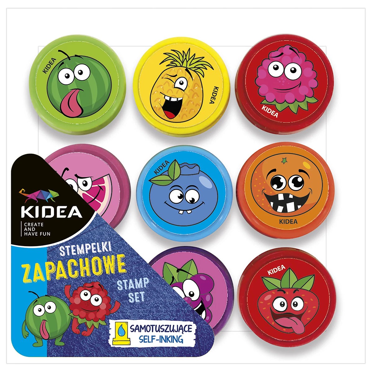 Stempelki zapachowe wzbogacone zostały w przyjemny aromat, który uatrakcyjnia produkt i sprawia, że dzieci chętniej po nie sięgają. Nowe, ciekawe wzory w szalone owoce (malina, truskawka, pomarańcza, arbuz, grejpfrut, jagoda, ananas, jabłko, winogrono) udekorują każdy rysunek małego artysty. Stempelki są samotuszujące, więc nie wymagają używania dodatkowej poduszki z tuszem.