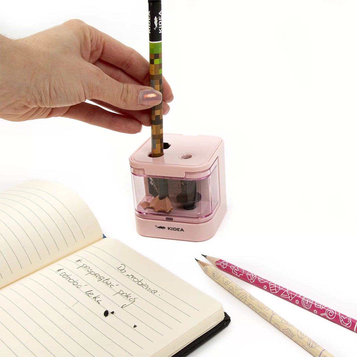 W temperówce zamontowano czujnik bezpieczeństwa, dzięki któremu temperówka nie będzie ostrzyć, gdy wyciągniemy pojemnik na strużyny. Pastelowy, różowy odcień i wyjątkowy design temperówki świetnie prezentuje się na biurku.