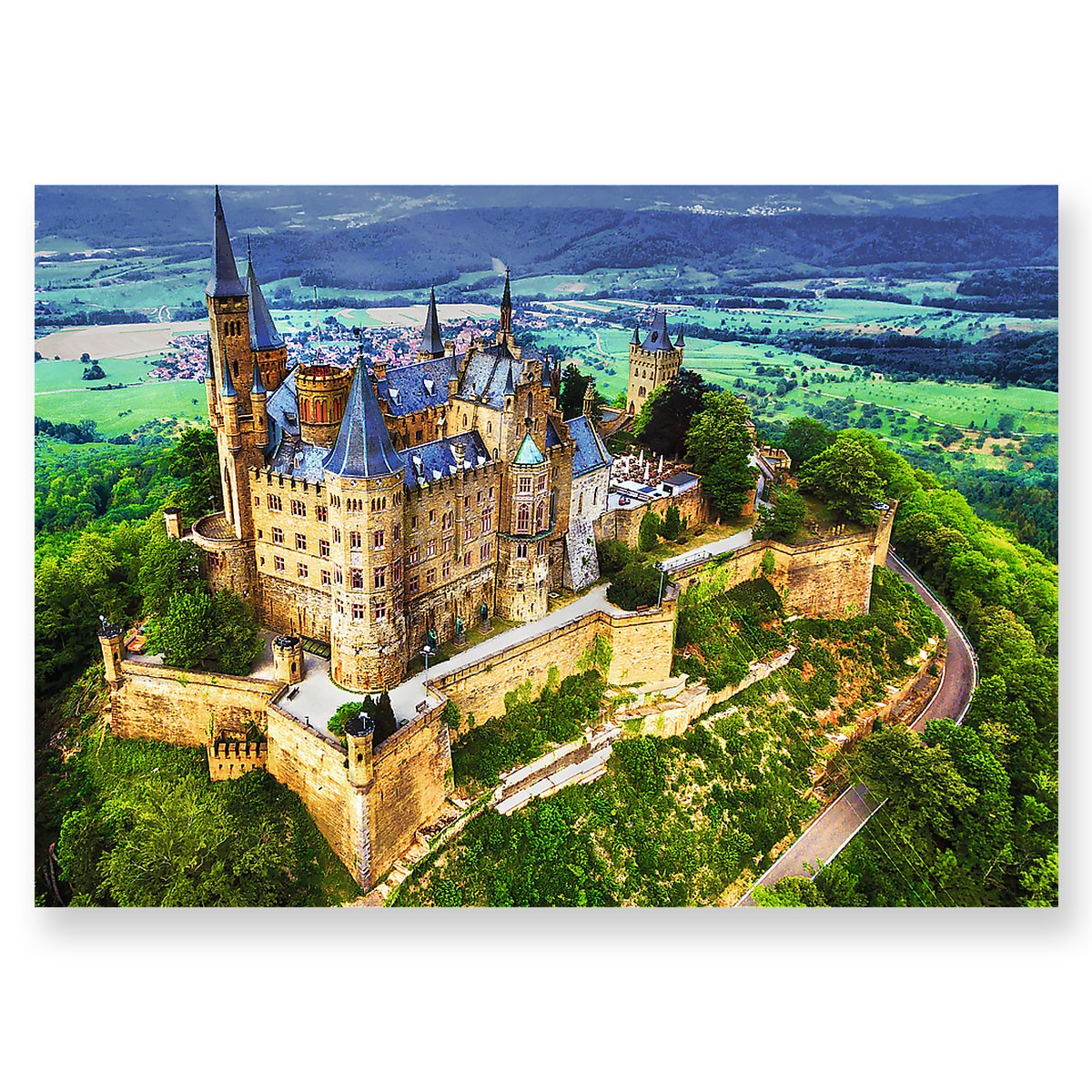 Puzzle Zamek Hohenzollern, Niemcy przedstawiają zwieńczony wieżami XIX-wieczny zamek, położony na szczycie góry. Po ich ułożeniu powstanie obraz o wymiarach 683x480 mm.
