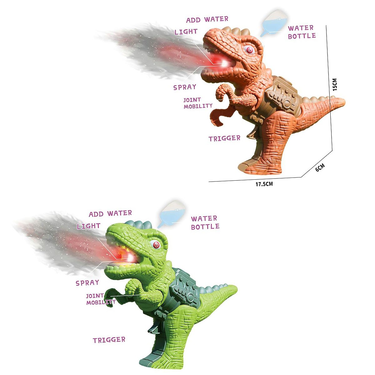 Pistolet w kształcie dinozaura, który dodatkowo jest wyposażony w efekty. Efekt świetlny oraz dym, który możemy stworzyć w prosty sposób - dodając wodę.