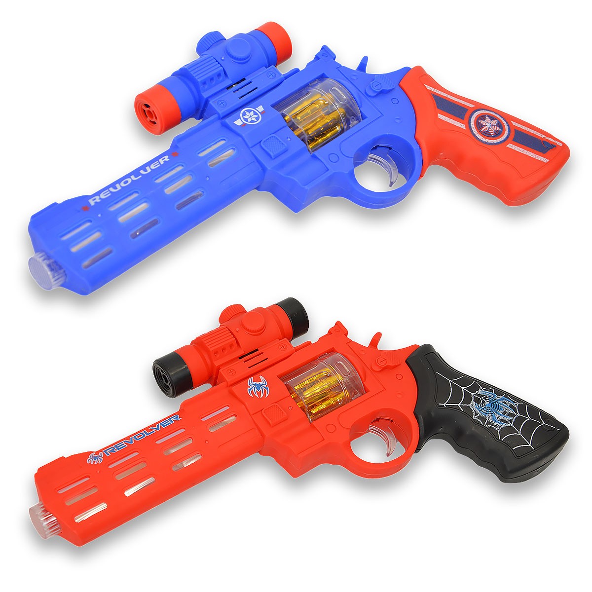 Bardzo atrakcyjna broń na baterie, która po naciśnięciu spustu, który znajduje się w rękojeści, wydaje dźwięki oraz świeci różnymi kolorami.