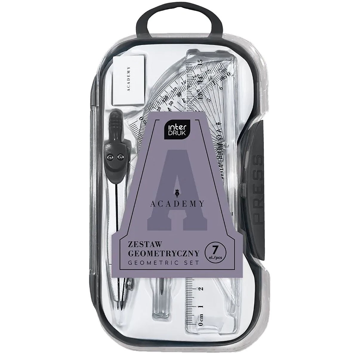 Zestaw geometryczny w praktycznym wytrzymałym etui na zatrzask, umożliwiającym bezpieczne przechowywanie i przenoszenia.