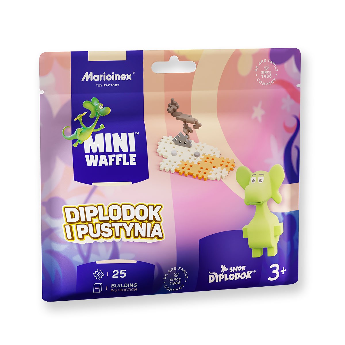 Zestaw Diplodok i Pustynia z serii Mini Waffle to 25 elementów, z których stworzysz fragment pustyni z charakterystyczną roślinnością, oraz figurką przezabawnego smoka Diplodoka. Ten ciekawski smok nieustannie podróżuje i odkrywa nowe kawałki świata. Wyruszcie na wspólną przygodę razem!