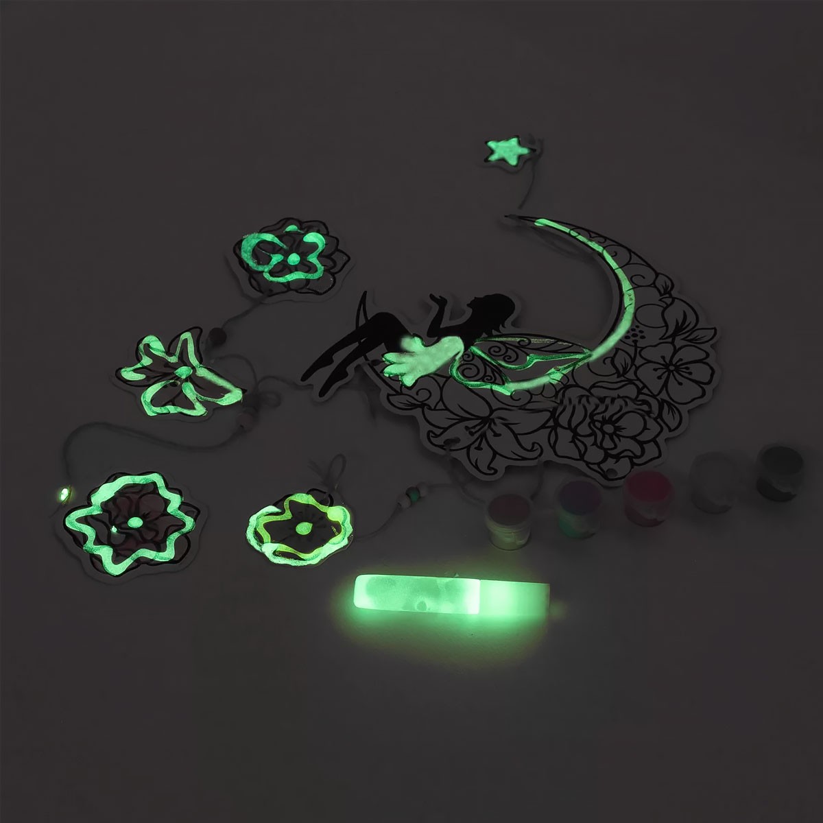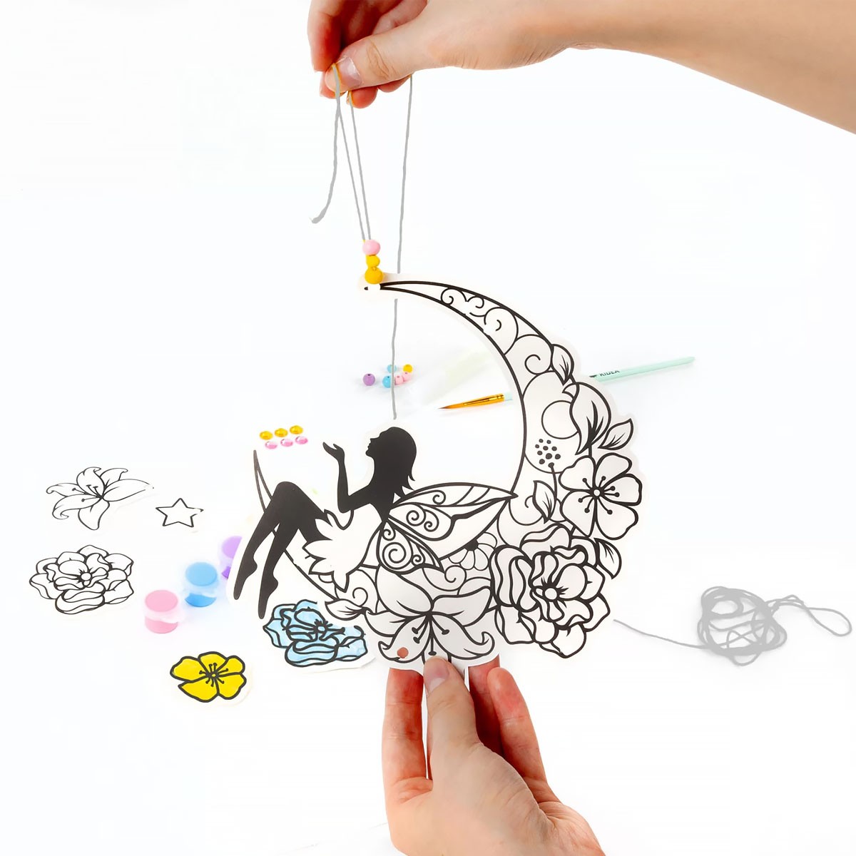 Łapacz marzeń świecący w ciemności. Zaprojektuj swój magiczny łapacz z tekturowym szablonem wróżki siedzącej na księżycu otoczonej bajkowymi kwiatami, który pięknie udekoruje pokój. Zestaw zawiera wszystko co jest potrzebne do stworzenia niesamowitej dekoracji. W opakowaniu znajduje się 9 koralików, 6 diamencików, 6 tekturowych kształtów, 5 kolorów farb oraz pędzelek, klej świecący i sznurek, którym złączysz całość elementów. To świetny sposób na twórcze spędzenie czasu i uzyskanie pięknej ozdoby. Ta wciągająca zabawa sprawdzi się również jako prezent