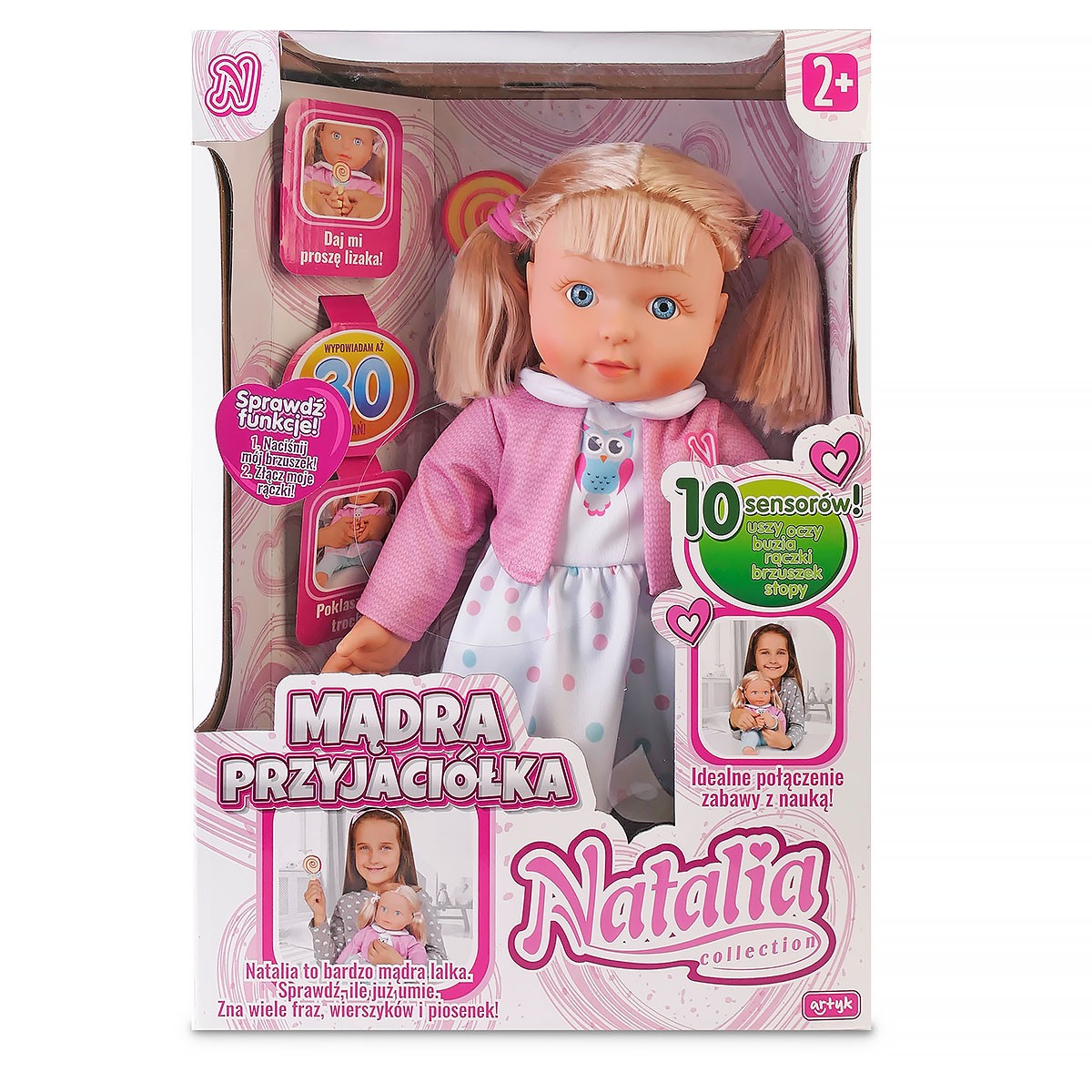 Mądra przyjaciółka od Natalia Collection to interaktywna lalka o bogatym zasobie fraz, wierszyków i piosenek. Lalka posiada 10 sensorów ukrytych w różnych częściach ciała. Dzięki temu, kiedy przyłożysz rączkę lalki do nogi lub oczu wypowie ona dedykowane zdanie lub wierszyk!