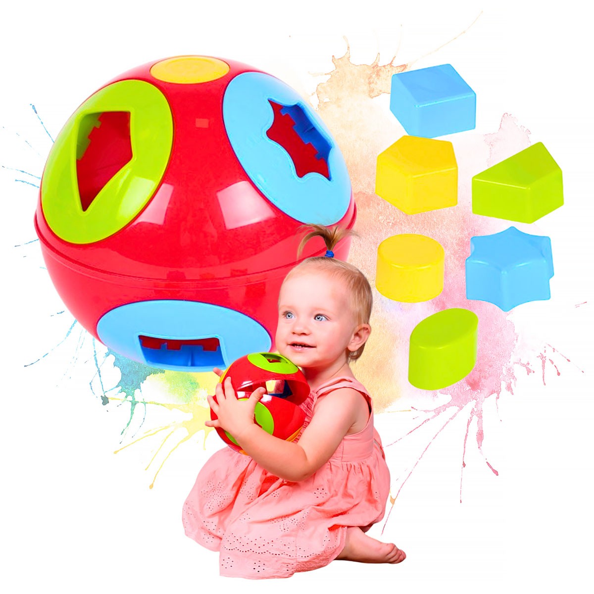 W zestawie znajduje się kula o średnicy 14cm oraz 6 klocków w różnych kształtach geometrycznych.