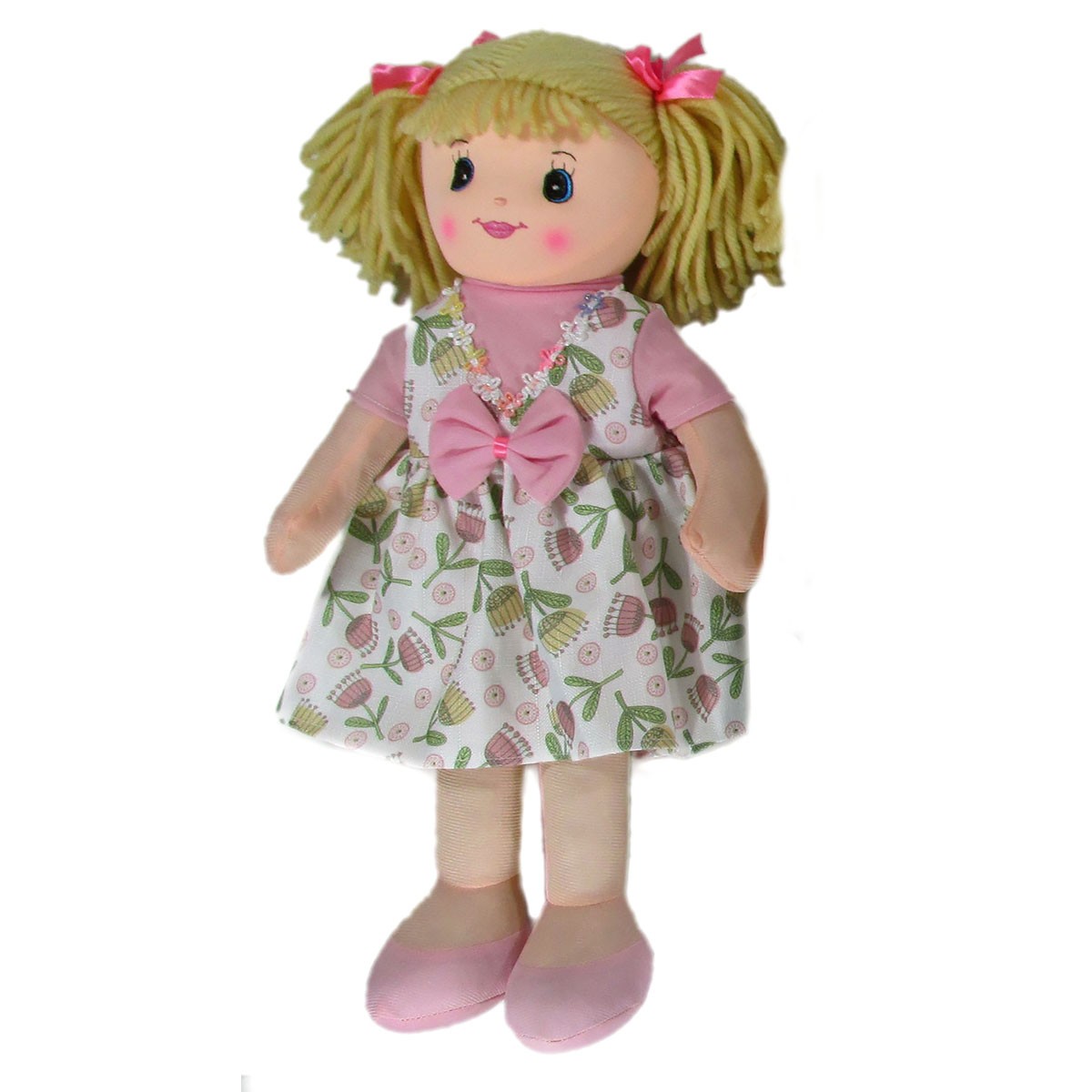 Miękka lala ma na sobie kolorowe ubranko i długie włosy z kolorowymi kokardkami.