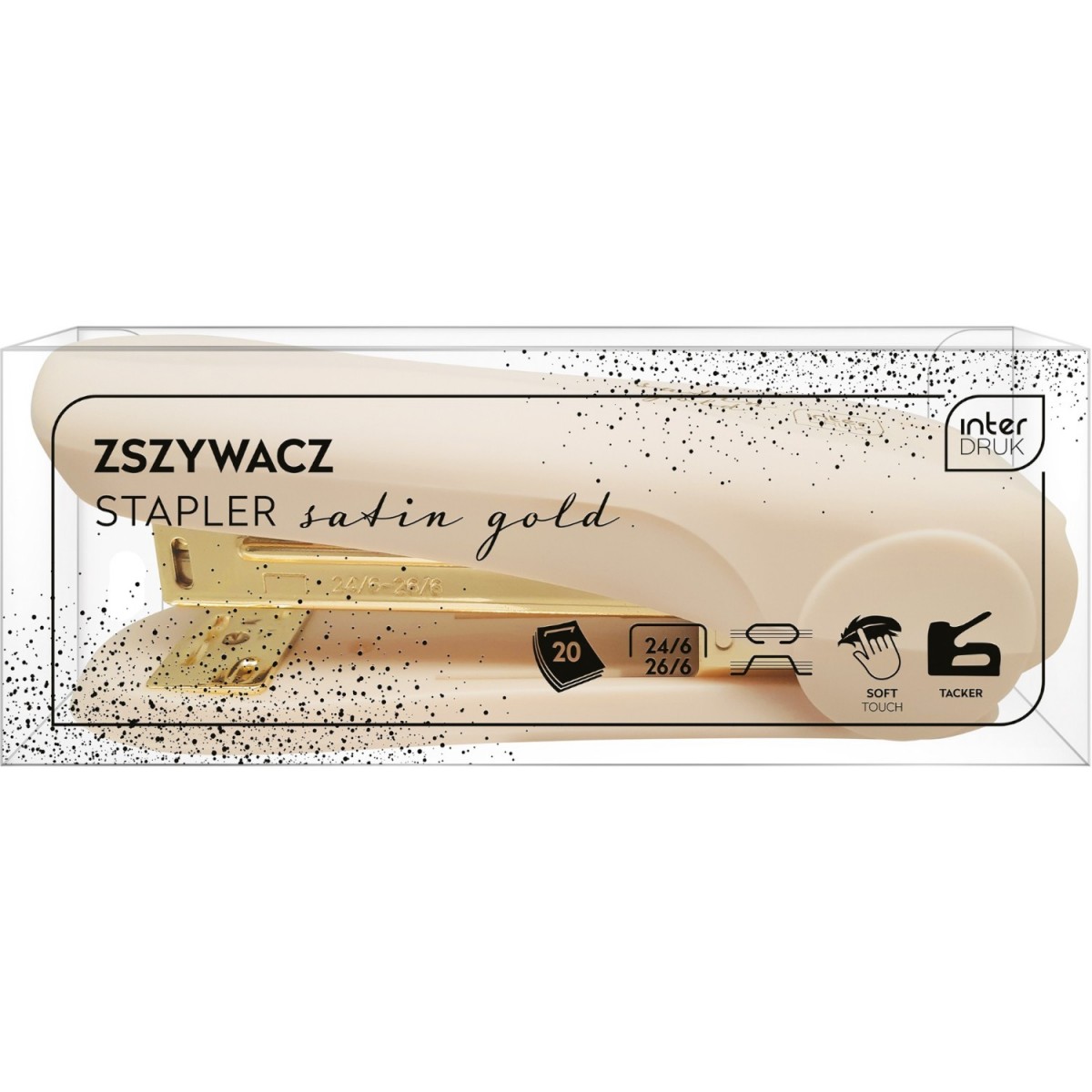 Zszywacz w 3 stylowych kolorach. Miła w dotyku obudowa soft touch. Wyposażony w dwie opcje zszywania. Rozmiar zszywek: 24/6 lub 26/6. Zszywa do 20 kartek.