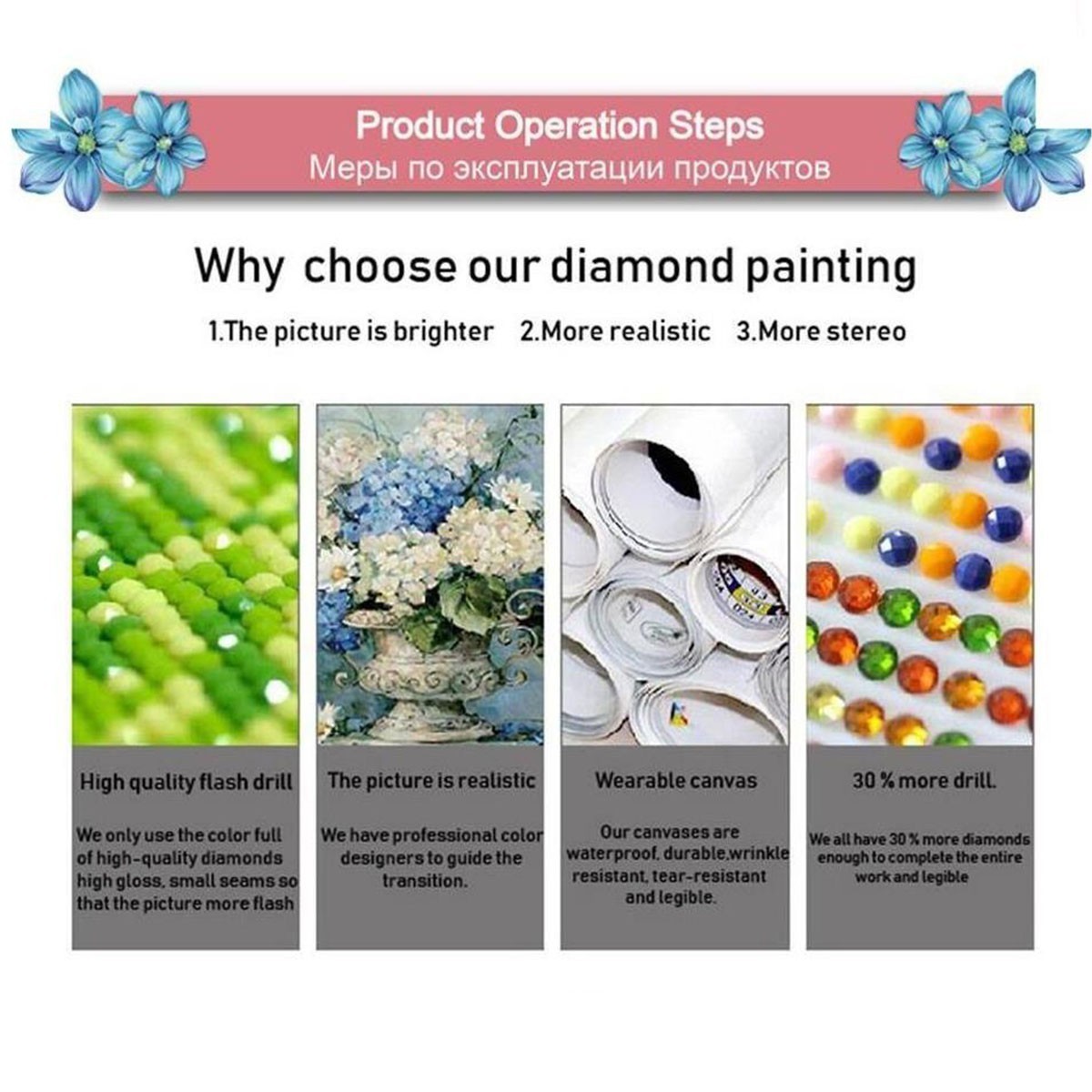 2. Płótno pokryte jest warstwą kleju, który umożliwia przyklejanie diamencików. Pamiętaj aby odklejać folię ochronną tylko z tego fragmentu płótna który będziesz wypełniać diamencikami. Folię odklejaj stopniowo wraz z kolejnych elementów dzięki czemu unikniesz wyschnięcia kleju na pozostałej części płótna.
