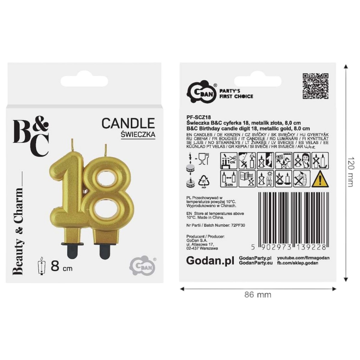 Złota świeczka na tort 18, na osiemnaste urodziny, rozpali urodzinowe emocje do białości! Olśniewająco piękna, jak wszystkie produkty z kolekcji Beauty&Charm, z pewnością będzie wisienką na Twoim osiemnastkowym torcie.