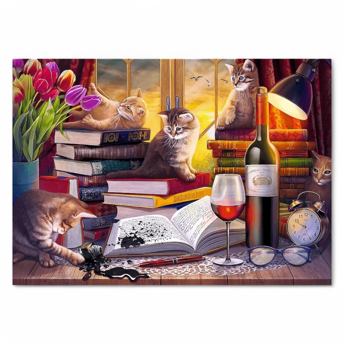 Puzzle Koci wieczór składające się z 2000 elementów przedstawiają rozrabiające kociaki otoczone tomami książek. Po ułożeniu powstanie obraz o wymiarach 961x682 mm.