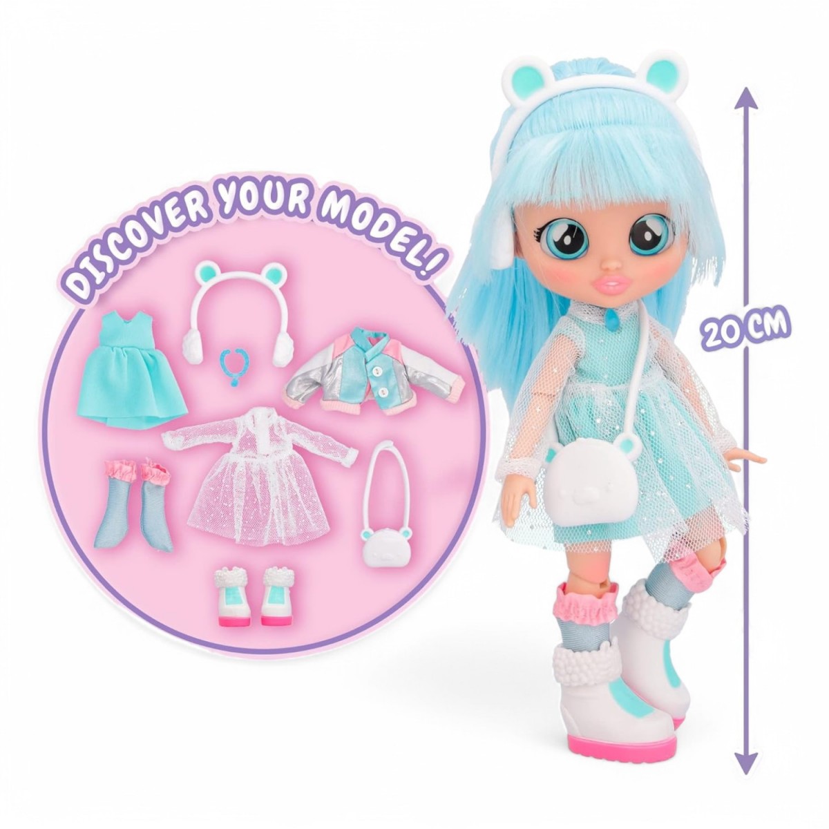 Lalka ma piękne długie włosy w odcieniu błękitu, które możesz czesać i stylizować. Jej zimowa stylizacja składa się z błękitnej sukienki z tiulowymi detalami, ciepłej kurteczki oraz uroczego plecaka w kształcie niedźwiadka. Zestaw zawiera także modne dodatki, takie jak białe nauszniki z uszkami, naszyjnik, skarpetki oraz kozaki z futerkowym wykończeniem. Ruchome stawy sprawiają, że Kristal może przybierać różne pozy, co urozmaica zabawę i umożliwia tworzenie scenek tematycznych.