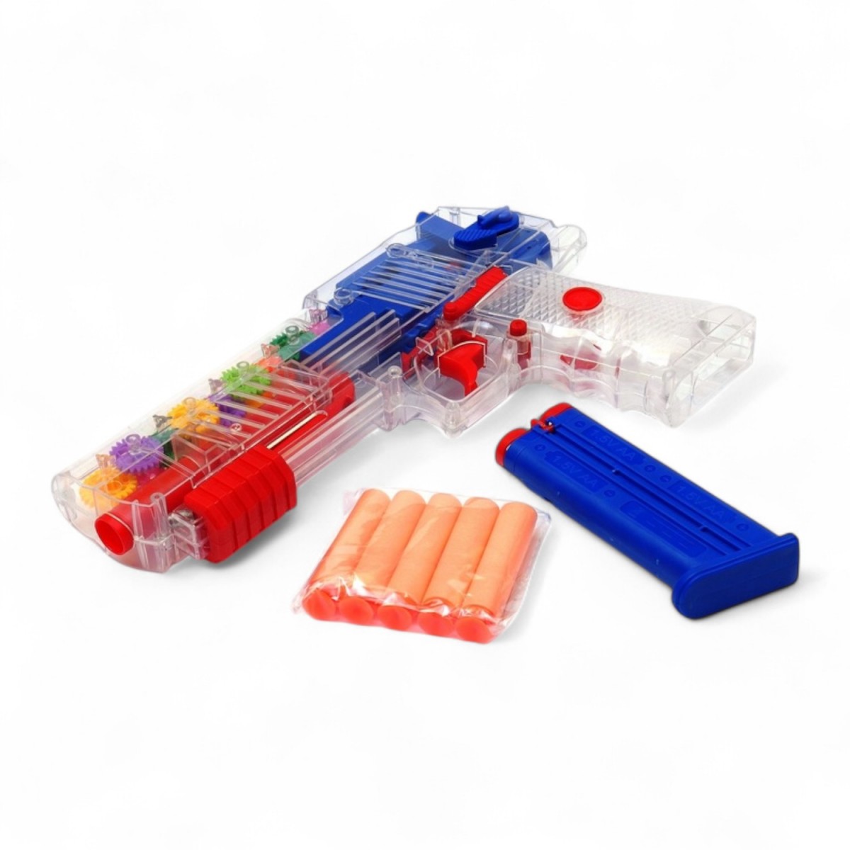 Krabin strzela piankoweymi strzałkami, błyska światłami i wydaje odgłosy strzelania i upadających łusek.