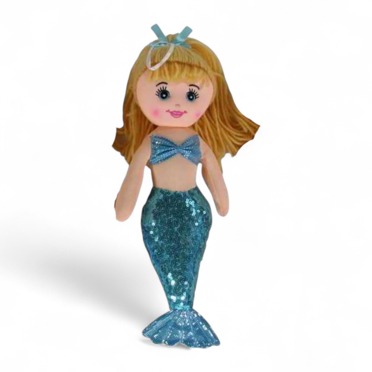 Miękka lala ma na sobie kolorowe ubranko i długie włosy z kolorowymi kokardkami.