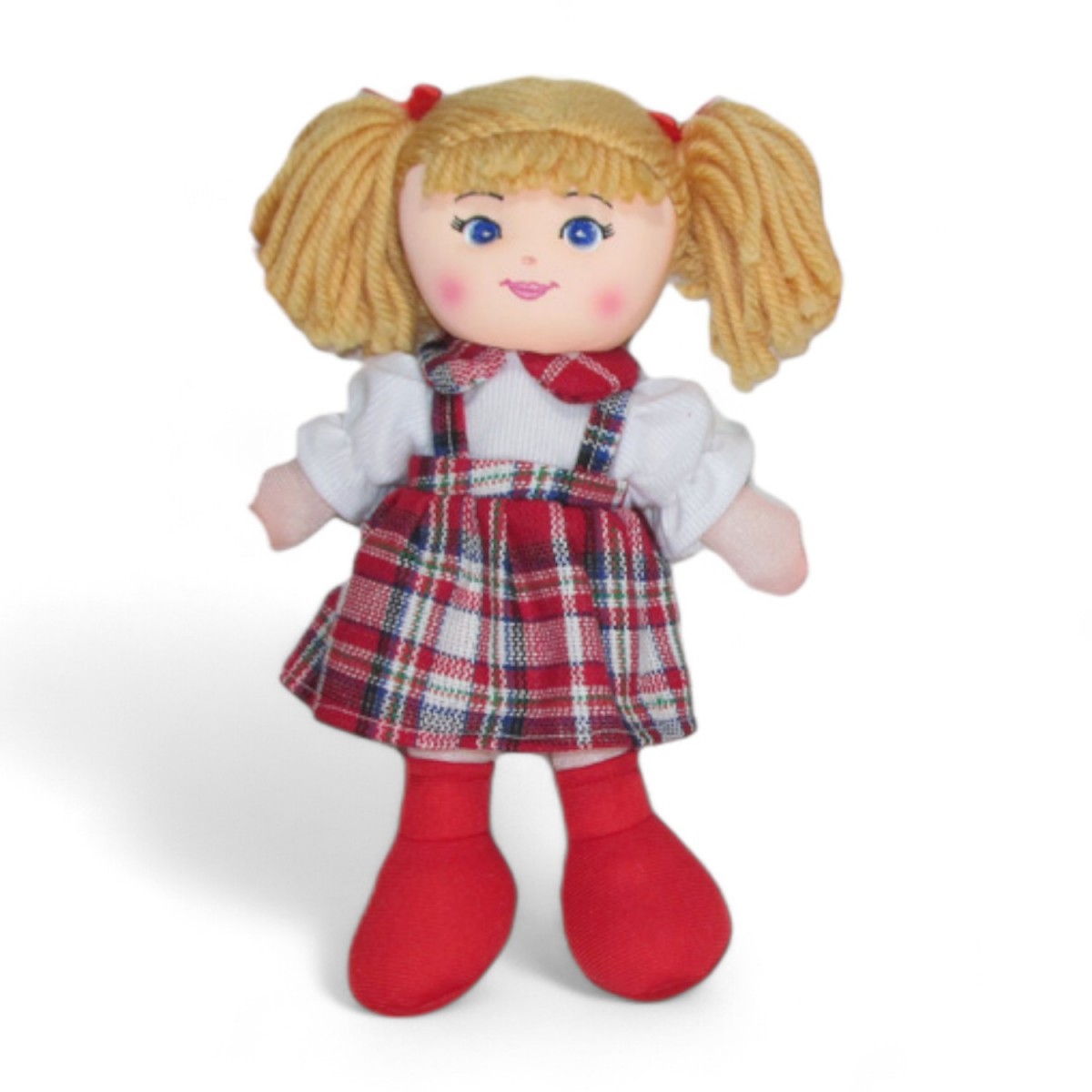 Miękka lala ma na sobie kolorowe ubranko i długie włosy z kolorowymi kokardkami.