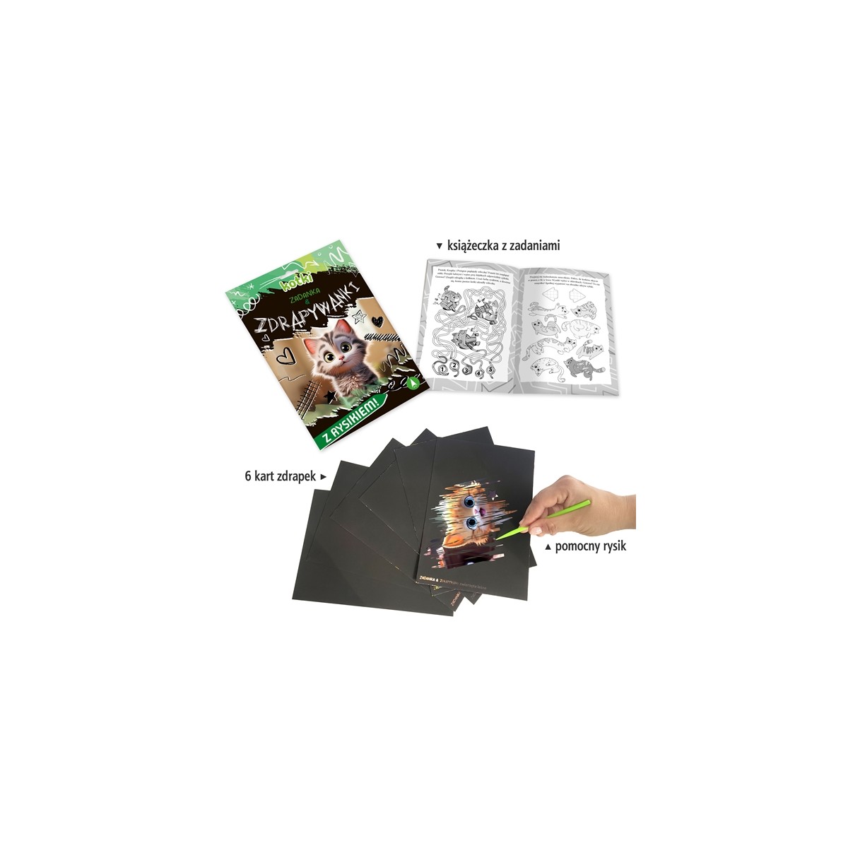 - 6 kart zdrapek, a na nich: ukryte obrazki oraz pole do wydrapania wskazanych kształtów