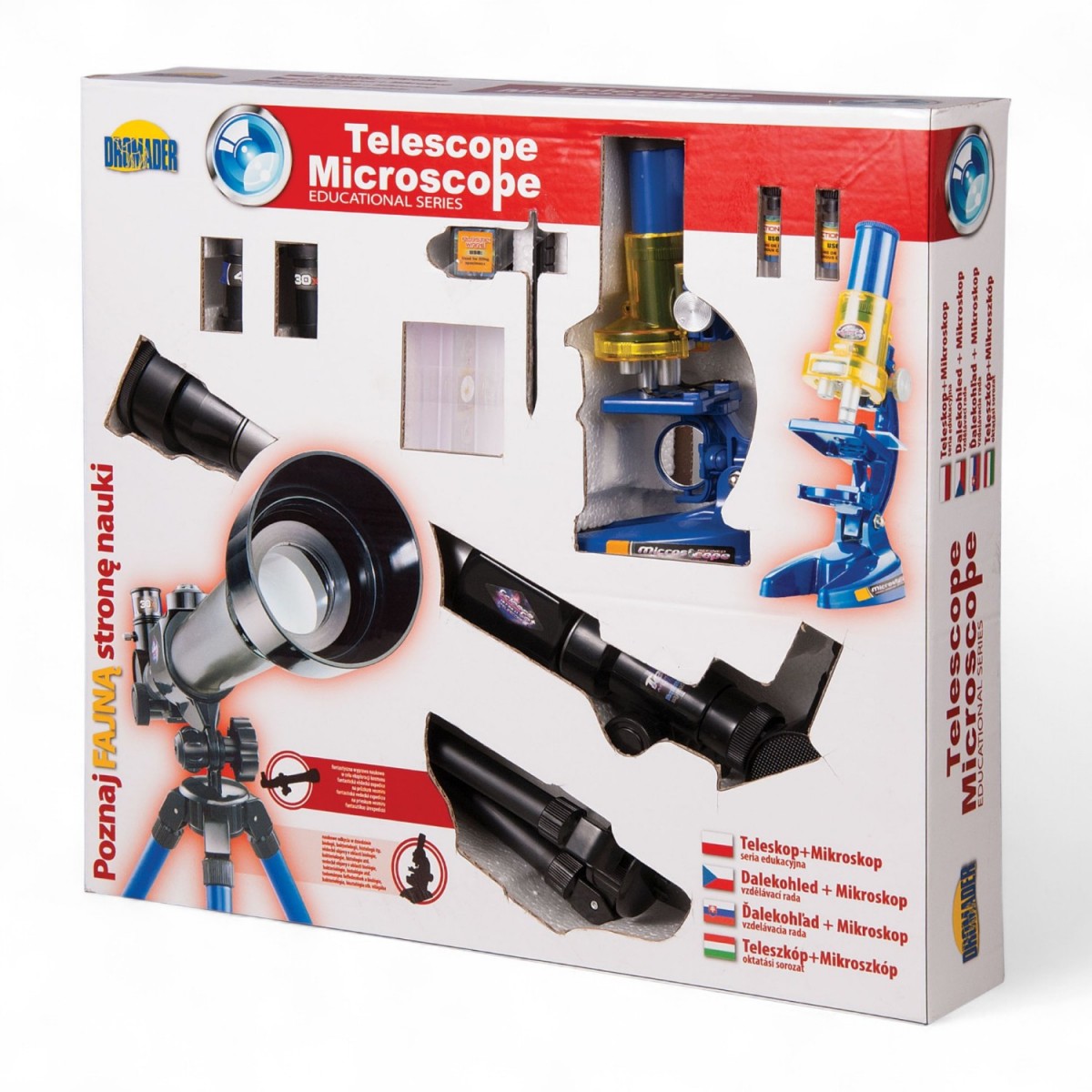 Zestaw edukacyjny - mikroskop i teleskop. Komplet pozwala na obserwowanie gwiazd i elementów przyrody. Mikroskop umożliwia powiększenie 100x, 200x i 450x. Został wyposażony we wszystkie klasyczne elementy (pokrętło do powiększania, okular, lusterko, rękojeść). Specjalne pojemniczki i płytki razem z pęsetą umożliwiają nałożenie interesującej nas próbki w miejscu obserwacji. Długość ogniskowej teleskopu to 170mm. Posiada on obiektyw f60 z 3 wymiennymi nakładkami do powiększania (20x, 30x, 40x). Dzięki temu, że jest wyposażony w statyw, możemy w wygodny sposób obserwować niebo, np. zmieniają kąt nachylenia.