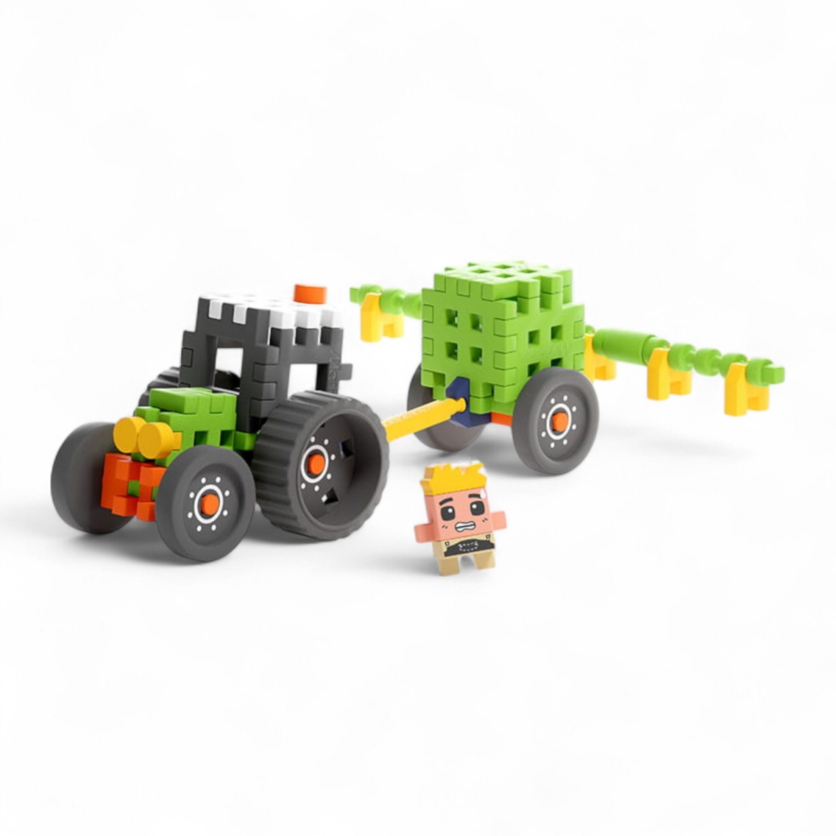 W zestawie znajduje się 50 elastycznych, kolorowych elementów, z których można zbudować realistyczny model traktora z opryskiwaczem oraz figurkę Andy’ego. Dzięki dużym kołom i specjalnej konstrukcji opryskiwacza zabawa nabiera realizmu i dynamiki.