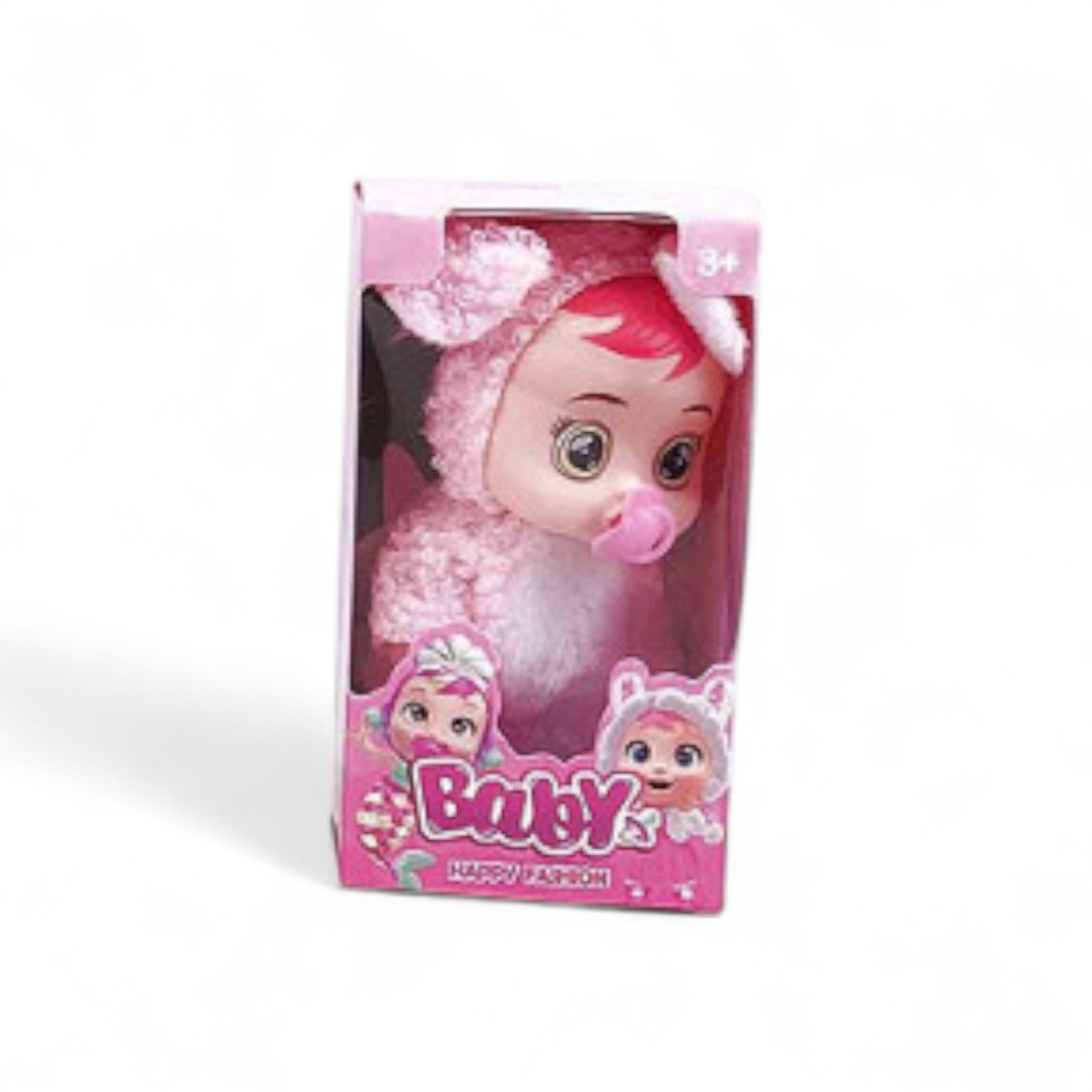 Lalka ma na sobie body i czapeczkę, a dodatkowo posiada smoczek.