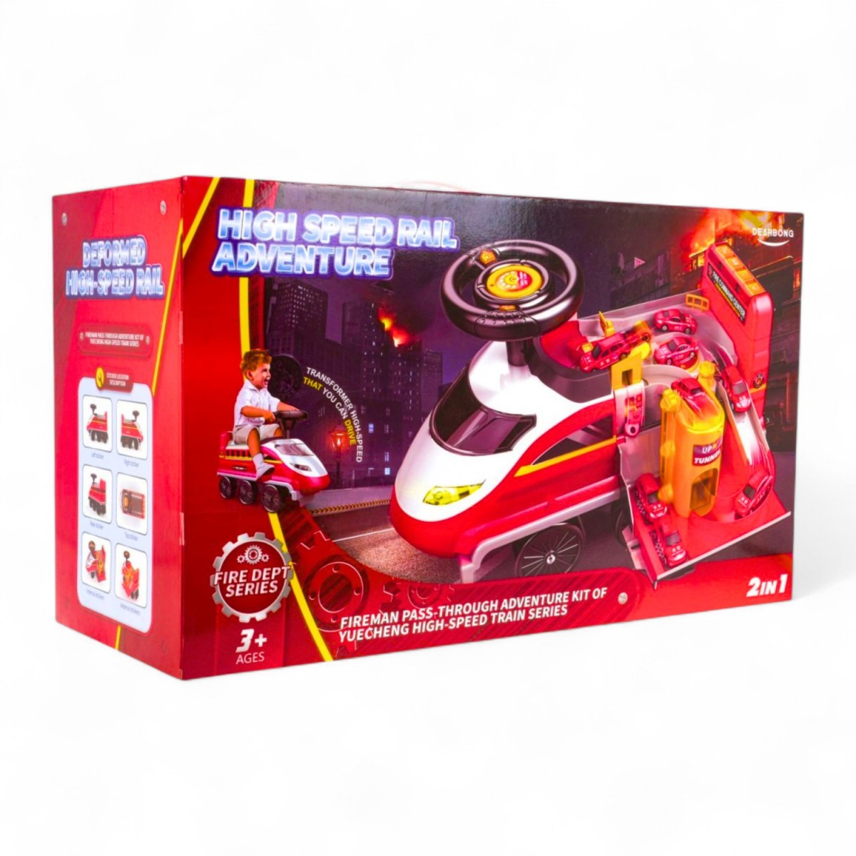 Jeździk to doskonały sposób na rozwijanie zdolności motorycznych i równowagi malucha. Wykonany z wytrzymałych materiałów, zapewnia bezpieczną zabawę zarówno w domu, jak i na zewnątrz podczas spacerów z rodzicami. Dodatkowym atutem są wysuwane podnóżki po obu bokach. Kierownica jest wyposażona w dwa guziki, dzięki którym kontrolować można efekty specjalne. Pojazd posiada 6 kół, na wzór pociągu, z czego dwa przednie są skrętne. Z tyłu jest chroniony panel z muzyką, opowiadaniami i odgłosami zwierząt (lektor nagrany w języku angielskim). Z przodu są świecące reflektory, a pod imitacją szybki - miejsce na drobiazgi. Kolejne miejsce na bagaż znajduje się pod parkingiem. Parking na samochodziki znajduje się pod siedzeniem jeździka i ma ruchome, ręcznie sterowane, elementy - winda, szlaban, podnośnik i kółko obrotowe. Do zestawu dołączone są małe autka (ok. 7 x 2,5 x 3cm), które idealnie pasują do parkingu.