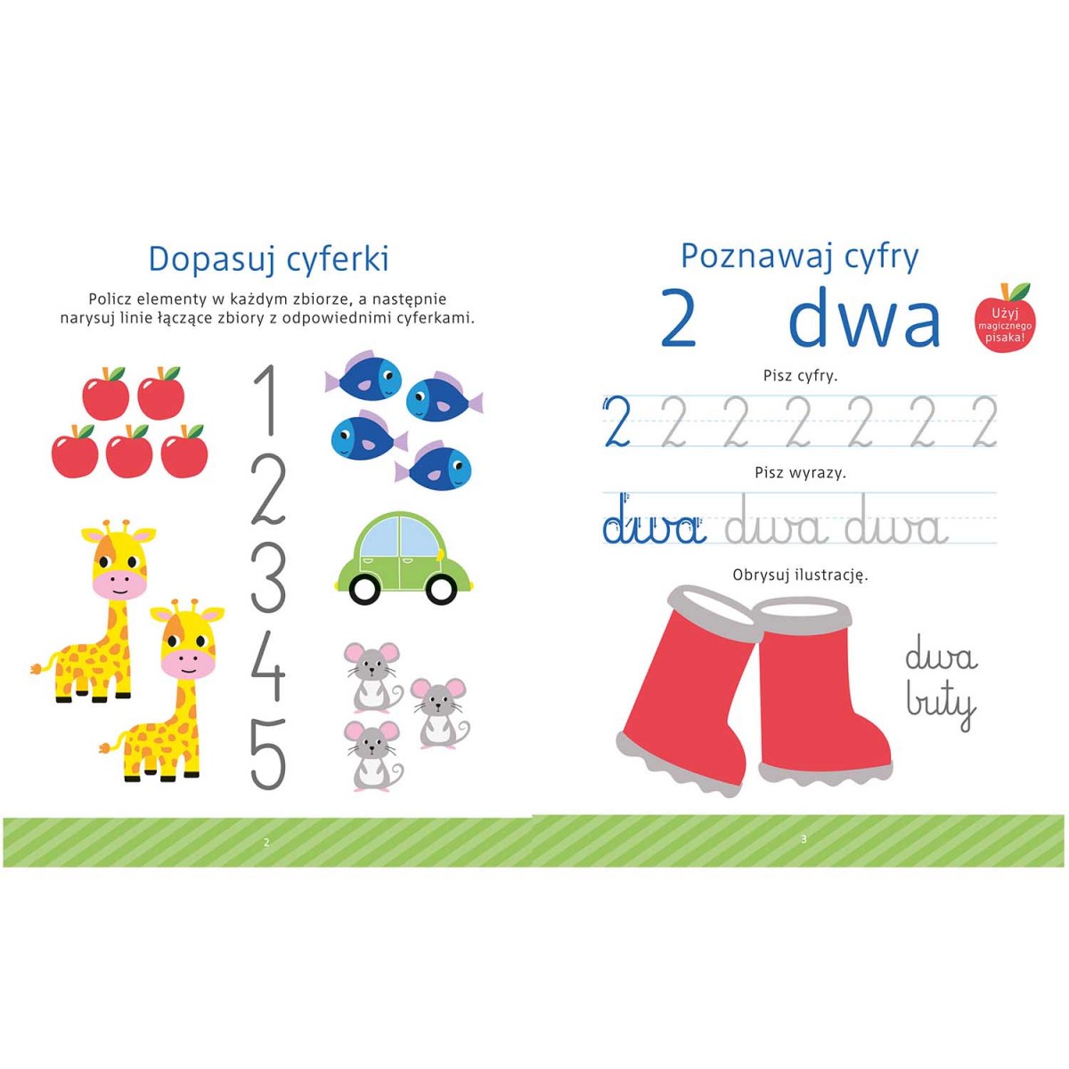 Do książki dołączono magiczny pisak ze znikającym tuszem, dzięki czemu dziecko może wielokrotnie powtarzać ćwiczenia bez obawy o błędy. W środku znajdują się również rowki do odwzorowania, które ułatwiają poprawne kreślenie kształtów i wspierają naturalny rozwój psychoruchowy dziecka.