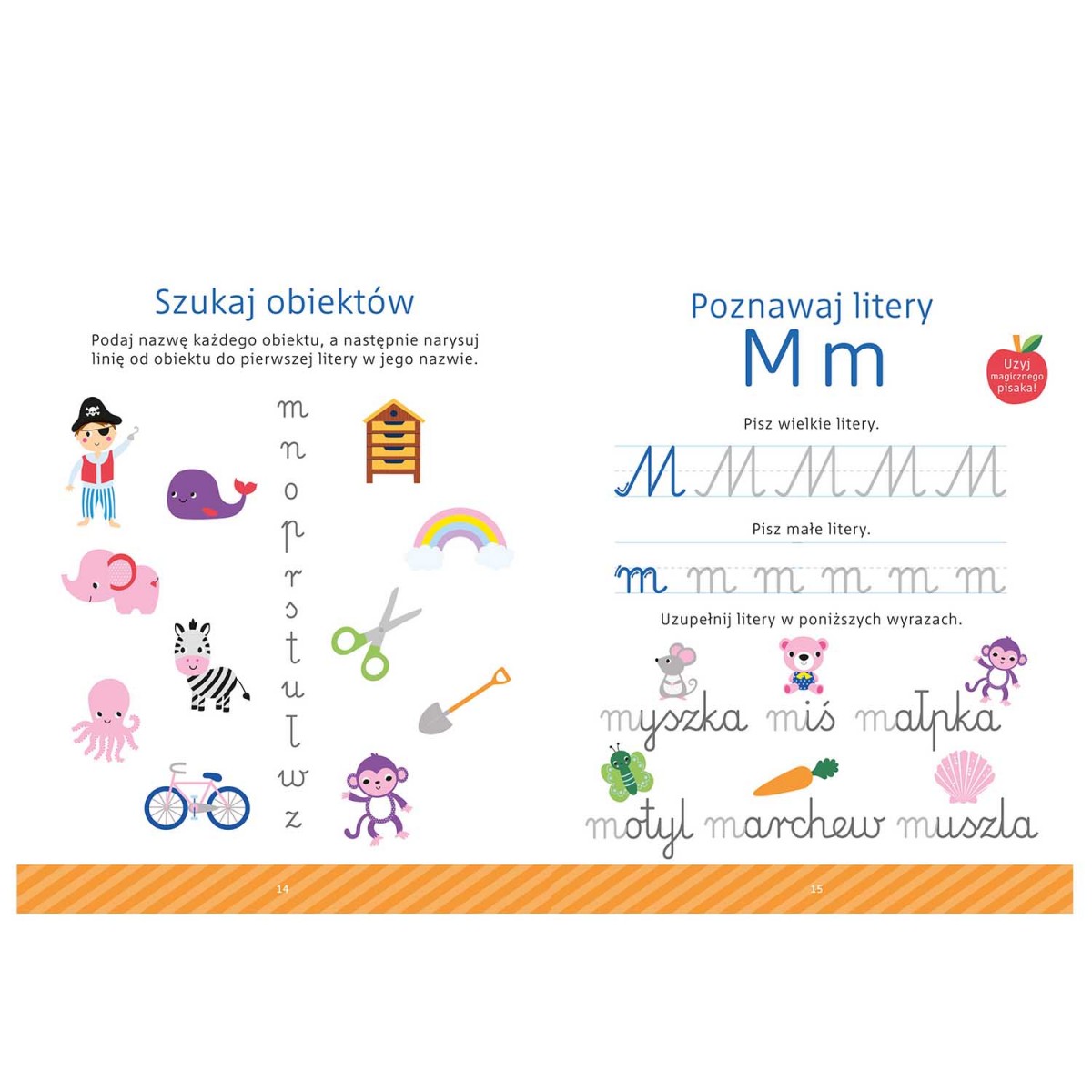 Do zestawu dołączono magiczny pisak ze znikającym tuszem, który pozwala wielokrotnie powtarzać ćwiczenia. W książce znajdują się także specjalne rowki do odwzorowania, ułatwiające poprawne kreślenie kształtów liter i wspierające prawidłowy rozwój psychoruchowy dziecka.