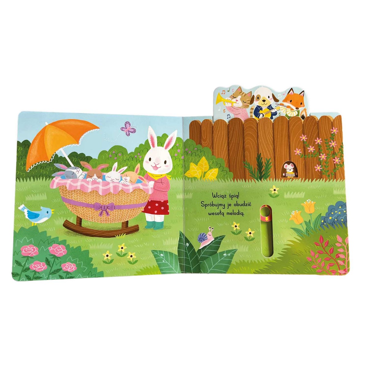 Książeczka z ruchomymi elementami Wesołe zwierzaki. Małe króliczki to interaktywna publikacja dla najmłodszych, która zachęca do aktywnego odkrywania świata. Dzięki przesuwanym i ruchomym elementom dziecko może brać czynny udział w opowieści o śpiących króliczkach, rozwijając przy tym koordynację ręka–oko oraz małą motorykę. Publikacja pobudza zmysły wzroku i dotyku, wspiera wyobraźnię przestrzenną oraz wzbogaca słownictwo poprzez krótkie i proste teksty. Kolorowe ilustracje pomagają poznać sympatyczne zwierzaki i sprawiają, że lektura staje się atrakcyjna i angażująca.