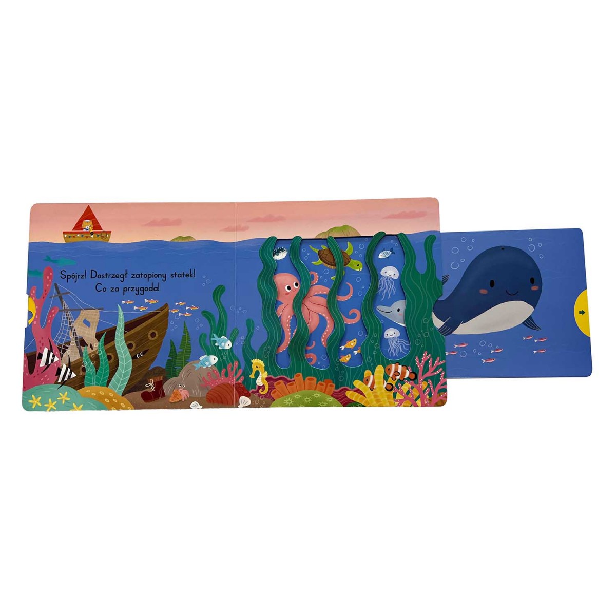 Książeczka z ruchomymi elementami Wesołe zwierzaki. Morska wyprawa to interaktywna propozycja dla najmłodszych, która przenosi w świat przygód kotka płynącego statkiem po morzu. Dzięki przesuwanym i ruchomym elementom dziecko może aktywnie uczestniczyć w morskiej podróży, rozwijając koordynację ręka–oko, małą motorykę oraz wyobraźnię przestrzenną. Publikacja pobudza zmysły wzroku i dotyku, a proste i krótkie teksty ułatwiają naukę nowych słów i rozwój słownictwa. Kolorowe ilustracje przedstawiają sympatyczne zwierzaki, które towarzyszą dzieciom w fascynującej wyprawie.