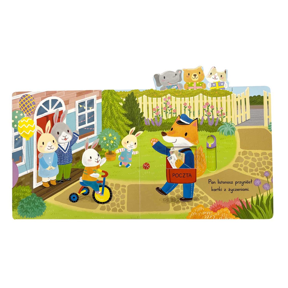 Książeczka z ruchomymi elementami Wesołe zwierzaki. Urodziny to interaktywna propozycja dla najmłodszych, która wprowadza w świat przygód małego królika, który ma urodziny. Dzięki przesuwanym i ruchomym elementom dziecko może aktywnie uczestniczyć w historii, rozwijając koordynację ręka–oko, małą motorykę oraz wyobraźnię przestrzenną. Publikacja pobudza zmysły wzroku i dotyku, a proste i krótkie teksty wspierają rozwój słownictwa. Kolorowe ilustracje przedstawiają sympatyczne zwierzaki i sprawiają, że lektura staje się angażującą zabawą edukacyjną.