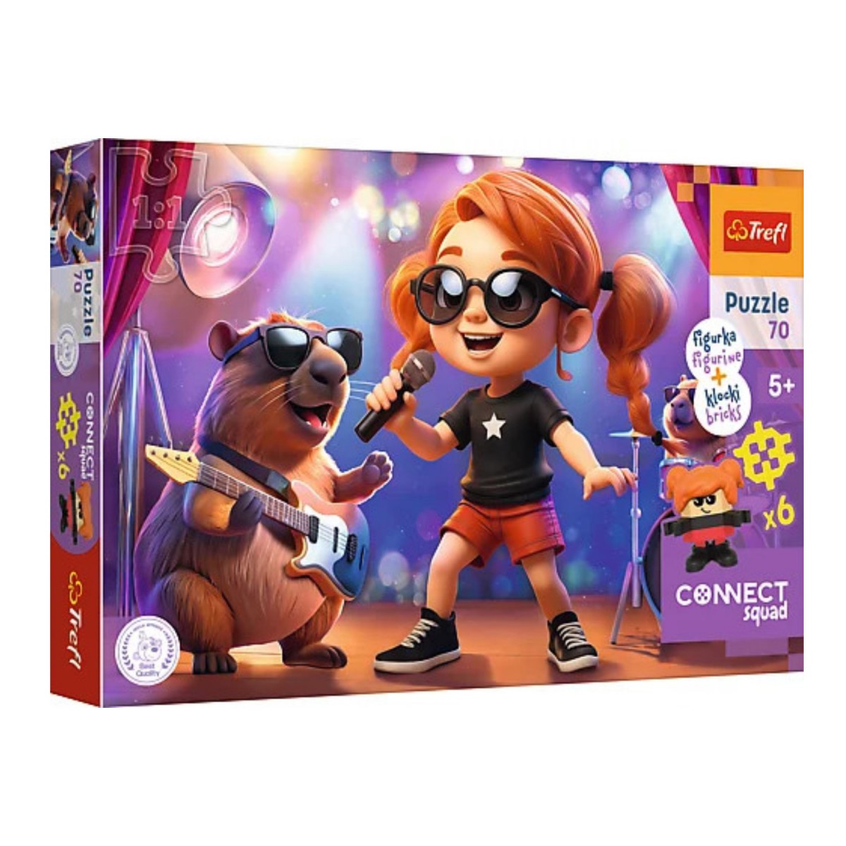 Connect Sue to puzzle składające się z 70 elementów, zaprojektowane z myślą o małych fanach klocków Connect. Po ułożeniu układanki powstanie obrazek o wymiarach 410x275 mm. W opakowaniu znajdziesz również figurkę bohatera z układanki plus 6 dodatkowych klocków.
